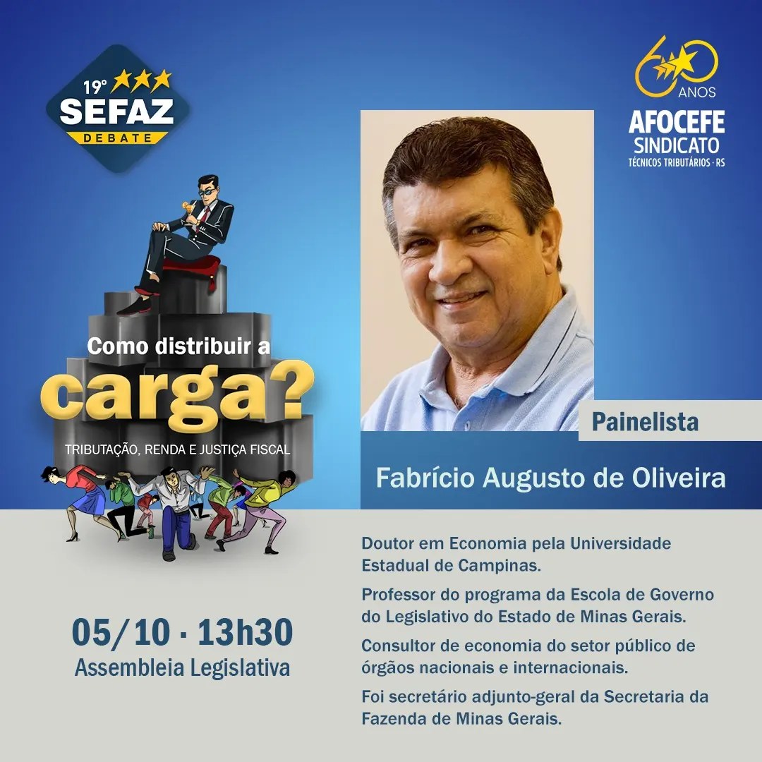 Promovido pelo Afocefe Sindicato, o evento contará com renomados especialistas nas áreas fiscal e tributária que falarão sobre a segunda etapa da Reforma Tributária, entre eles o doutor em Economia e professor do programa da Escola de Governo do Legislativo de Minas Gerais, Fabrício Augusto de Oliveira.