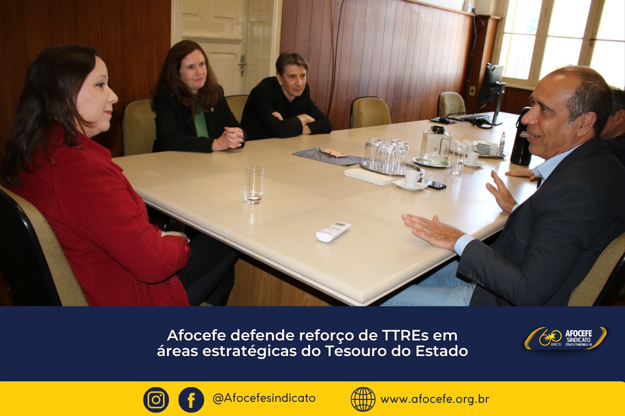 Para encaminhar questões abordadas em encontro realizado em 03 de agosto entre o Afocefe e TTREs da Divisão de Gestão da Folha de Pagamento (DGF), o presidente Alexandre Luzzi, a diretora Jurídica e Legislativa, Claudia Meyer e o diretor Adriano Vieira, reuniram-se na sexta-feira, 25, com a subsecretária adjunta do Tesouro do Estado, Juliana Debaquer. A reunião contou também com a presença do chefe da Assessoria de Orientação e Normatização, Diego Degrazia da Silveira.