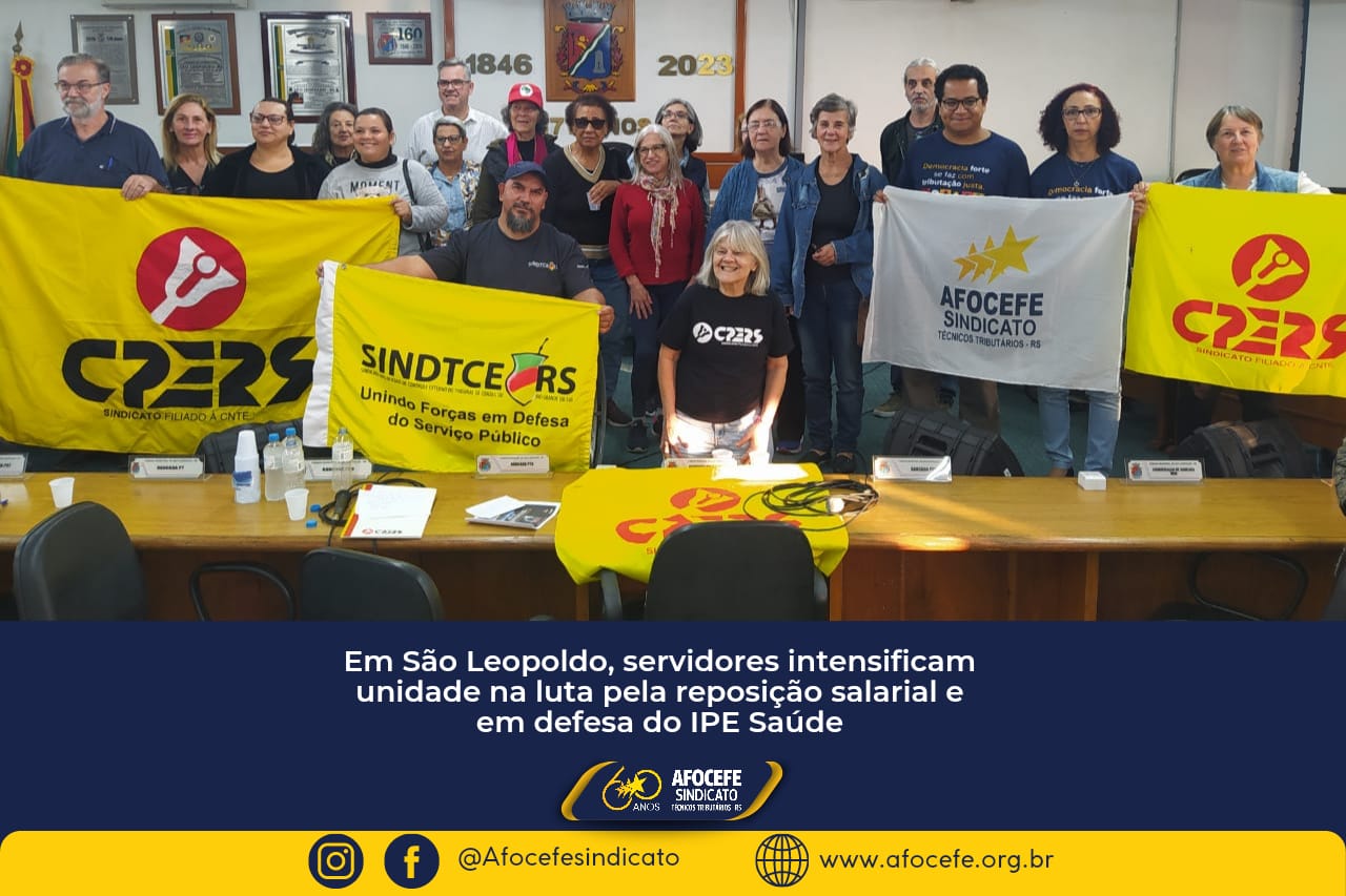 O Afocefe Sindicato, representado pelo diretor Wagner Bomfim e pela diretora Mariusa Fernandes, participou, nesta terça-feira, 06, de plenária na Câmara de Vereadores de São Leopoldo pela revisão geral dos salários do funcionalismo e em defesa do IPE Saúde. Além do Afocefe, participaram do encontro representantes do Cpers e do Sindtce.