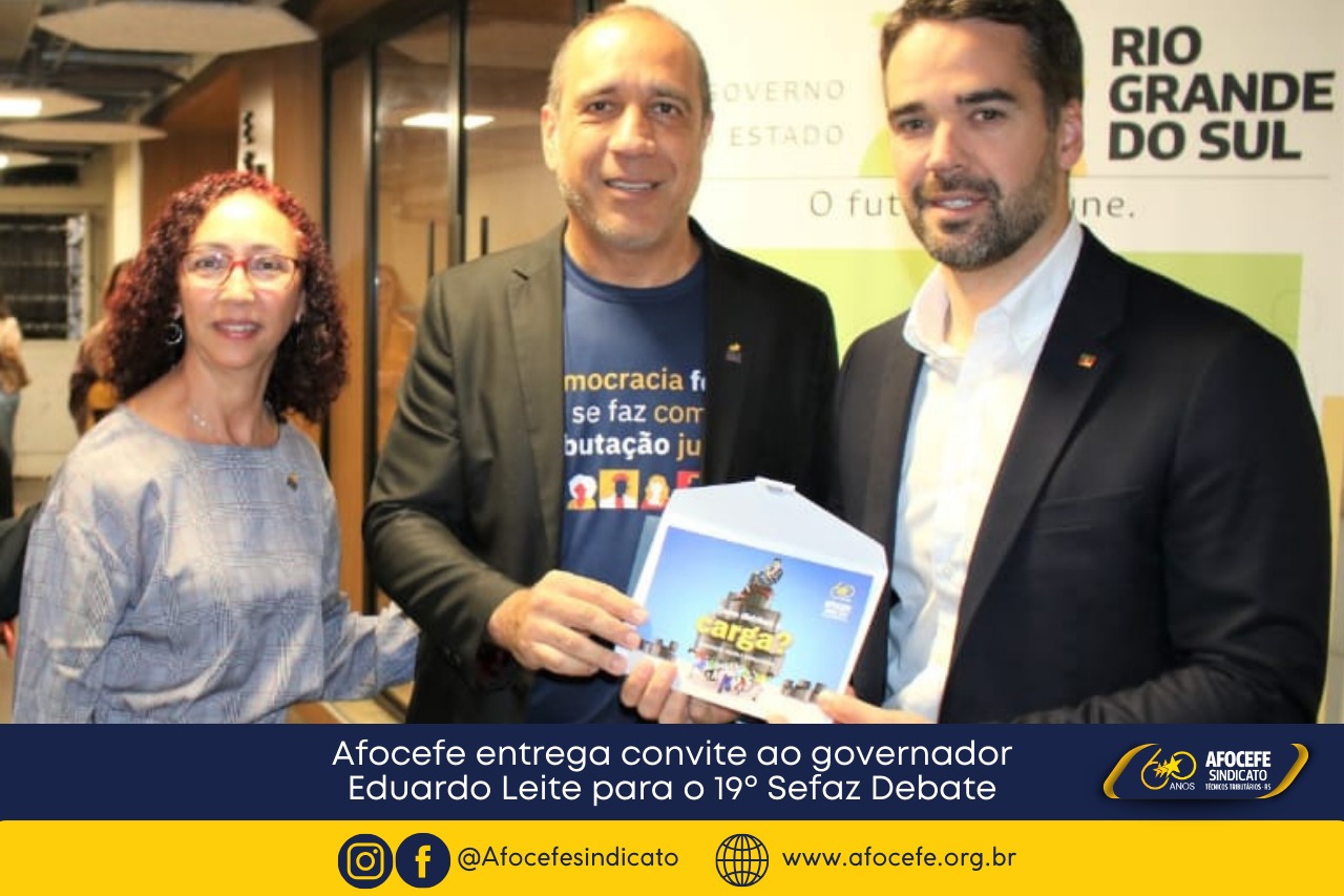 A diretoria do Afocefe Sindicato entregou, nesta terça-feira, 19, convite oficial ao governador Eduardo Leite para participar do 19º Sefaz Debate, que será realizado no dia 05 de outubro, às 14h, no Teatro Dante Barone da Assembleia Legislativa. O governador foi convidado também para a celebração dos 60 anos de fundação do Afocefe. O evento será realizado no Vestíbulo Nobre da Assembleia Legislativa, logo após o encerramento do Sefaz Debate.