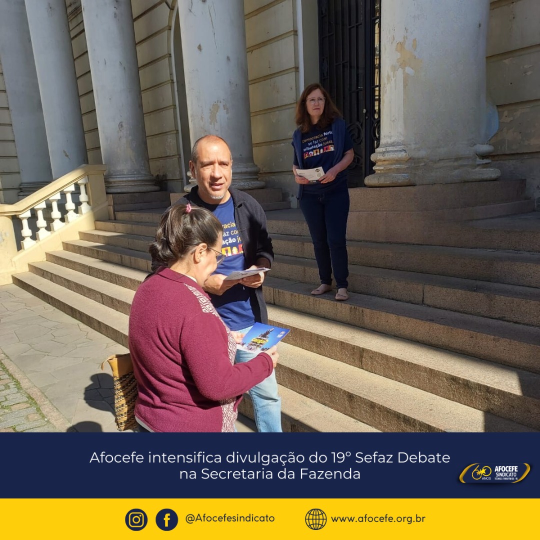 Para reforçar convite aos Técnicos Tributários da Receita Estadual e demais servidores da Secretaria da Fazenda para a 19ª edição do Sefaz Debate, a diretoria do Afocefe Sindicato esteve mobilizada na manhã desta terça-feira, 03, em frente à sede da Sefaz, distribuindo material de divulgação do evento.