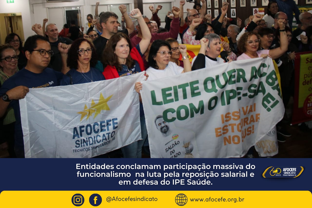 As entidades de integram a Frente dos Servidores Públicos (FSP/RS) realizaram grande ato de mobilização na última semana, na sede do Cpers Sindicato, pela revisão geral dos salários do funcionalismo e em defesa do IPE Saúde. A plenária teve a proposta ainda de chamar para audiência pública a ser realizada na quarta-feira, 14, às 10h, no Teatro Dante Barone da Assembleia Legislativa.