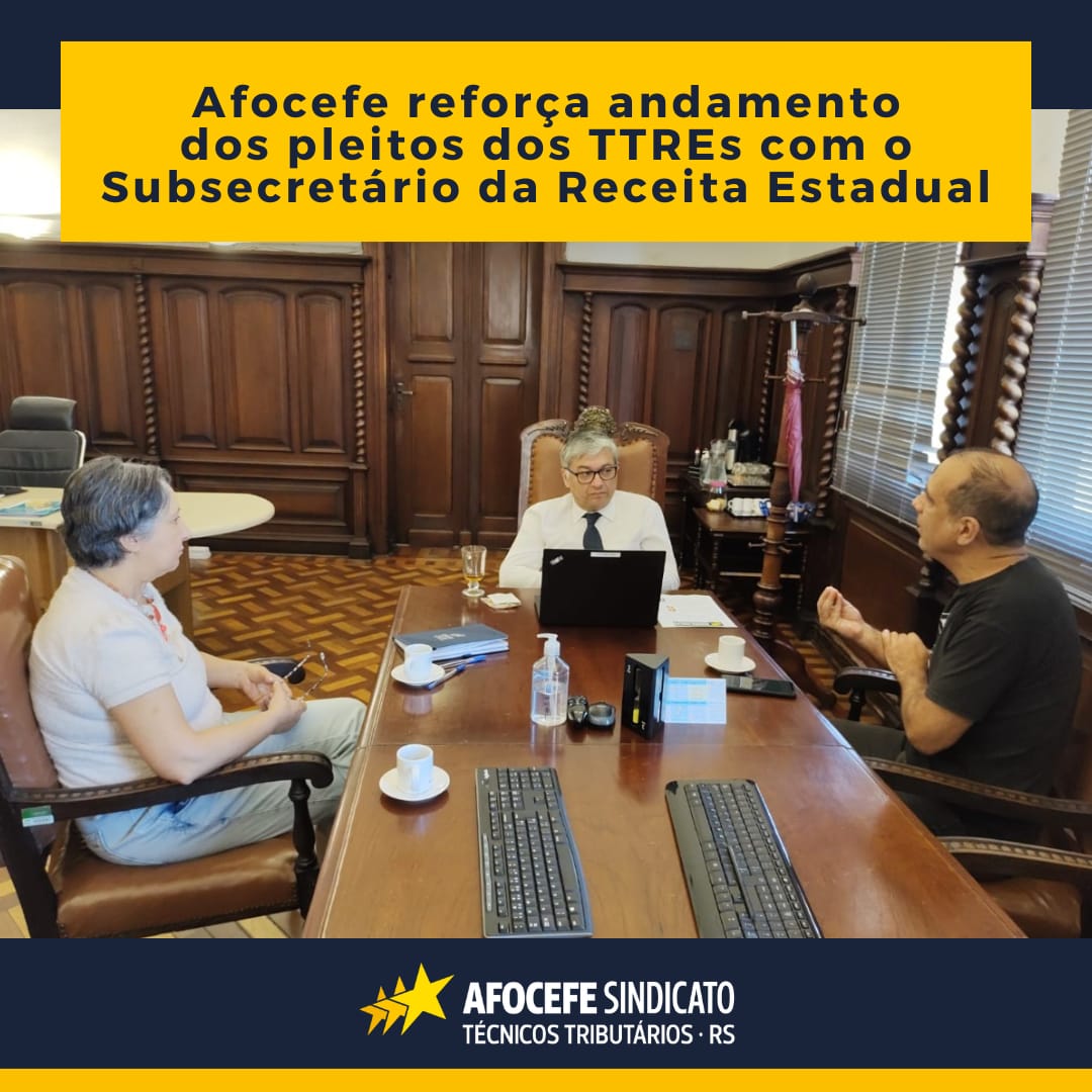 Em reunião realizada nesta sexta-feira, 28, com o Subsecretário da Receita Estadual, Ricardo Neves Pereira, o presidente do Afocefe, Alexandre Luzzi, a diretora de Assuntos Sindicais, Tânia Coelho de Souza e o diretor de Assistência ao Filiado, Wagner Bomfim reforçaram o andamento dos pleitos dos Técnicos Tributários.
