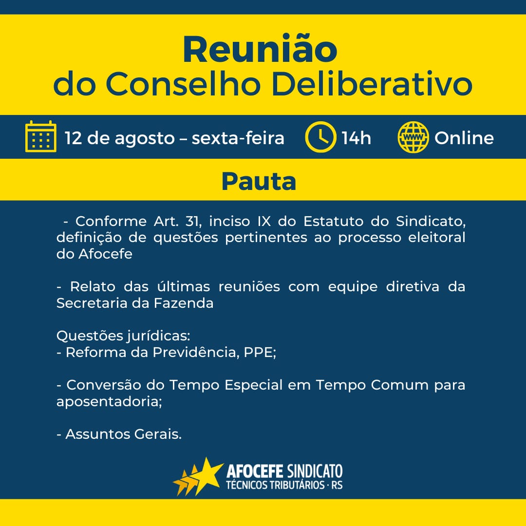 O Afocefe Sindicato reúne de forma virtual o Conselho Deliberativo, nesta sexta-feira, 12, às 14h.