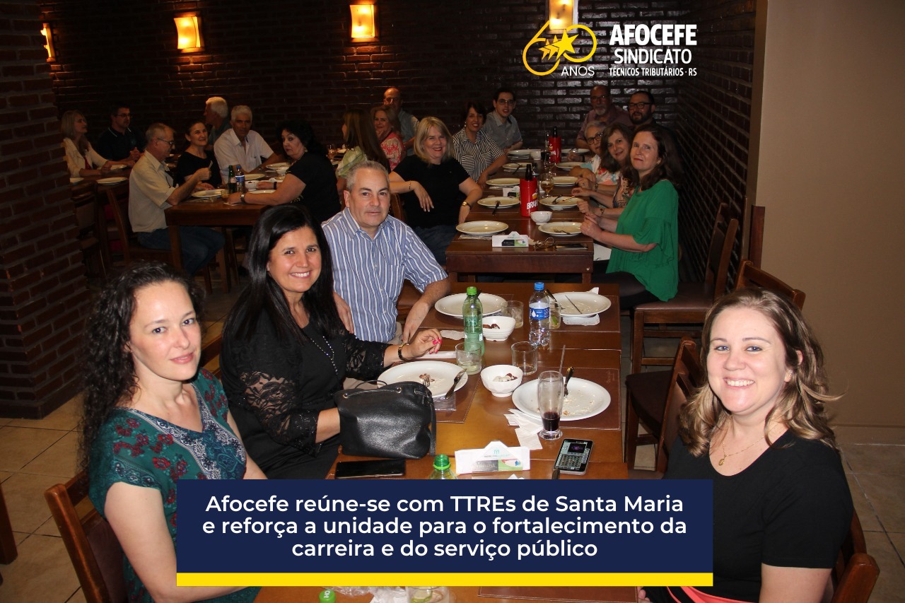 O Afocefe Sindicato, representado pelas diretoras Claudia Meyer, Mariusa Fernandes e Juliana Zucheto de Lima, participou, na sexta-feira, 25, da confraternização de final de ano dos Técnicos Tributários da Receita Estadual, em Santa Maria.