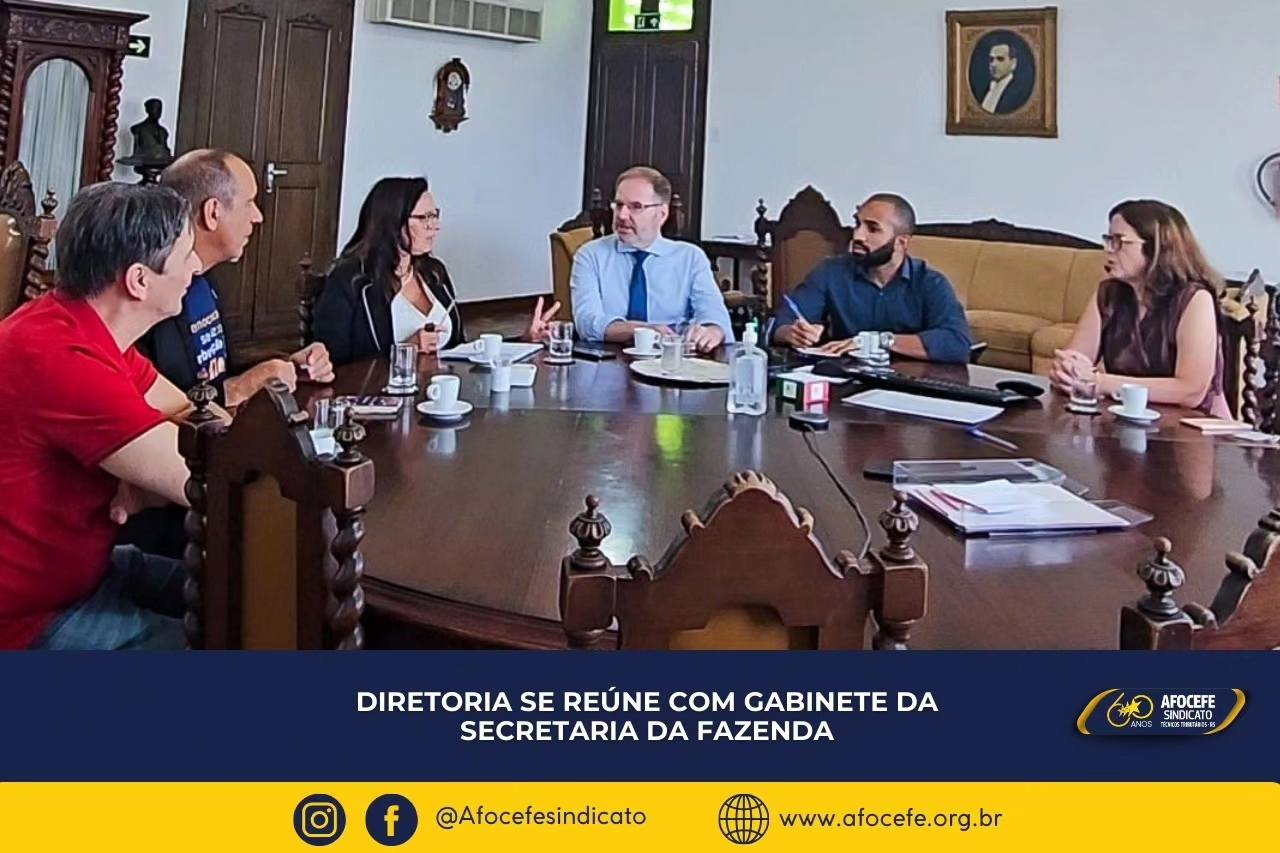 O Afocefe Sindicato reuniu-se nesta segunda-feira, 04, com o Gabinete da Secretaria da Fazenda para tratar das pautas que têm norteado os esforços da carreira, como o projeto de lei que modifica o cargo de técnico para analista tributário. Na oportunidade, foram recebidos pelo chefe de Gabinete, Giovanne de Sousa, pelo adjunto, Paulo da Fontoura Sacco, e pela diretora do Departamento de Administração, Adriana Oliveira da Silva. Estiveram representando o Sindicato o presidente Alexandre Luzzi, a diretora Jurídica Claudia Meyer e o diretor financeiro, Adriano Vieira.