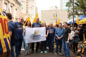 Na manhã de sexta-feira, 11/10, durante o Ato Unificado pela Revisão Geral dos Salários, organizado pela Frente dos Servidores Públicos (FSP-RS), Alexandre Luzzi, presidente do Afocefe Sindicato, parabenizou os Analistas Tributários da Receita Estadual e destacou os objetivos sindicais que motivaram a FSP, juntamente com outras duas entidades, a formalizar uma emenda ao PL 287/2024, que estabelece a Lei Orçamentária para 2025.