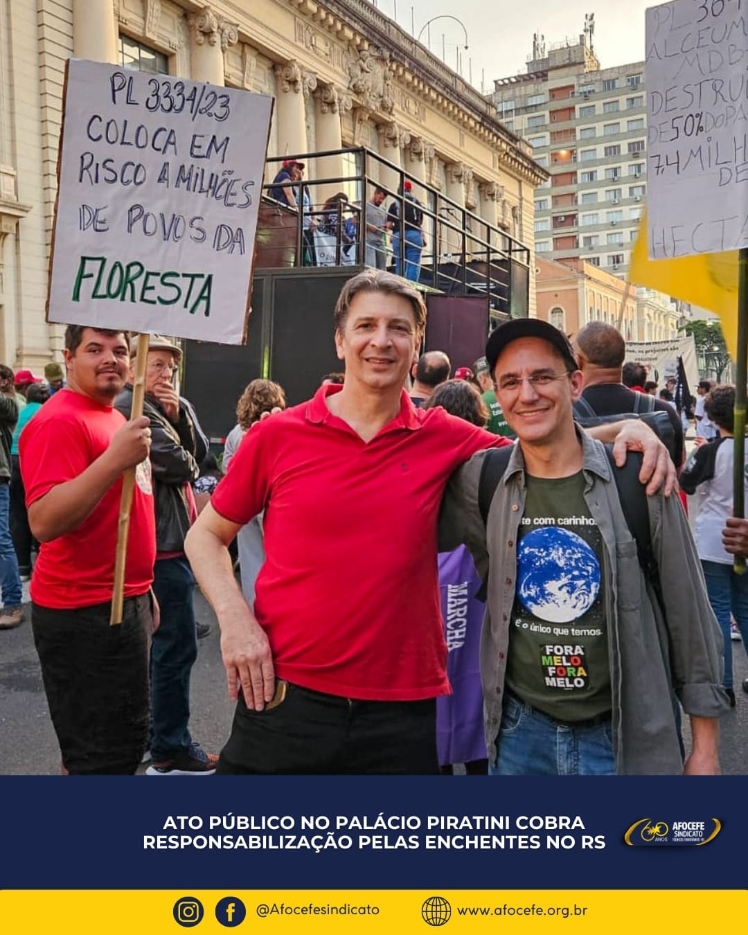 Na semana do Dia Mundial do Meio Ambiente, o Afocefe Sindicato, representado pelo diretor Adriano Vieira e o TTRE Volnei Picolotto, se uniu à Frente dos Servidores Públicos (FSP-RS) e a organizações da sociedade civil para promover um ato público em frente ao Palácio Piratini, sede do governo gaúcho, para lembrar que “a catástrofe que ocorreu no Rio Grande do Sul é político-ambiental”. O evento ocorreu na última sexta-feira, 7 de junho.