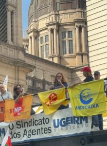 A dirigente ressaltou a importância de “brigar” pela manutenção e por melhores serviços do IPE saúde, bem como por uma remuneração justa para os servidores. Em frente ao Palácio Piratini, outros dirigentes das entidades que integram a FSP também subiram no caminhão para se pronunciar.