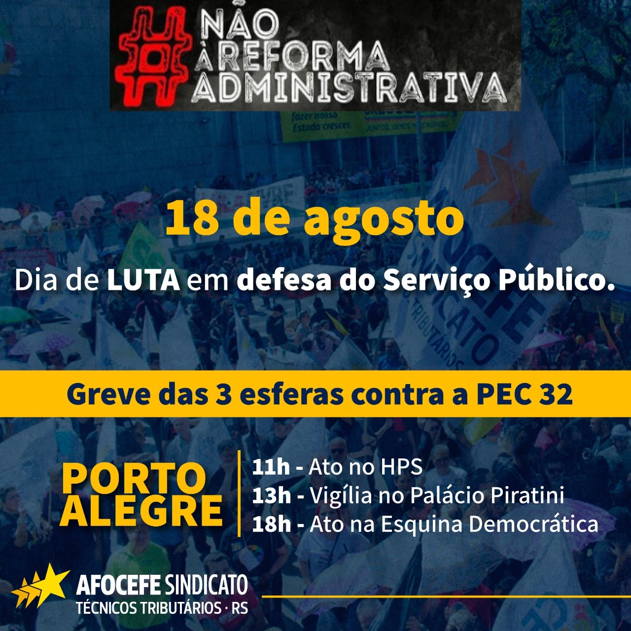 Nesta quarta-feira (18), servidores públicos estarão mobilizados em todo país em defesa do Serviço Público e contra a Reforma Administrativa (PEC 32).