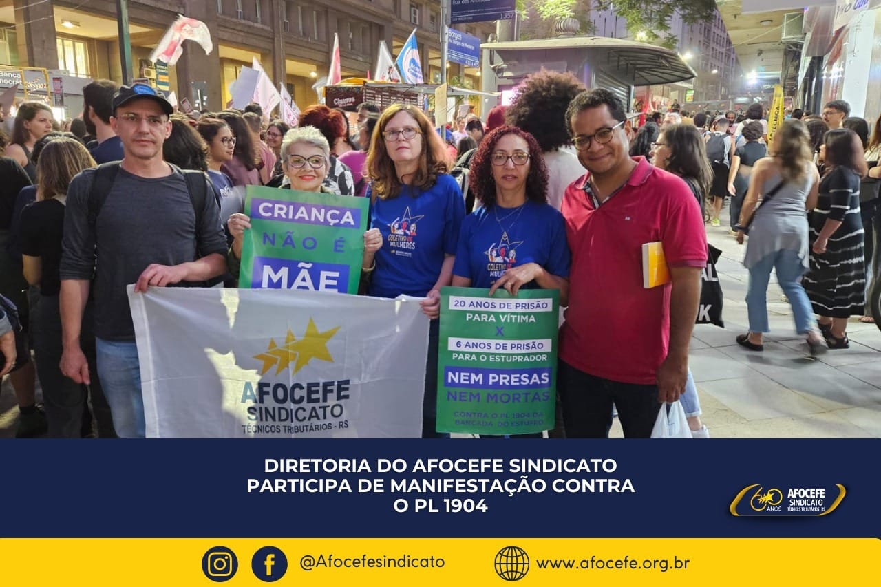 Na última sexta-feira, 14, as diretoras do Afocefe Sindicato, Claudia Meyer e Mariusa Fernandes, junto com o diretor Wagner Bomfim e colegas TTRES, participaram de um protesto contra o projeto de lei (PL) 1904/2024. O ato teve início na Esquina Democrática, no Centro da cidade, com uma caminhada até o Largo Zumbi dos Palmares.