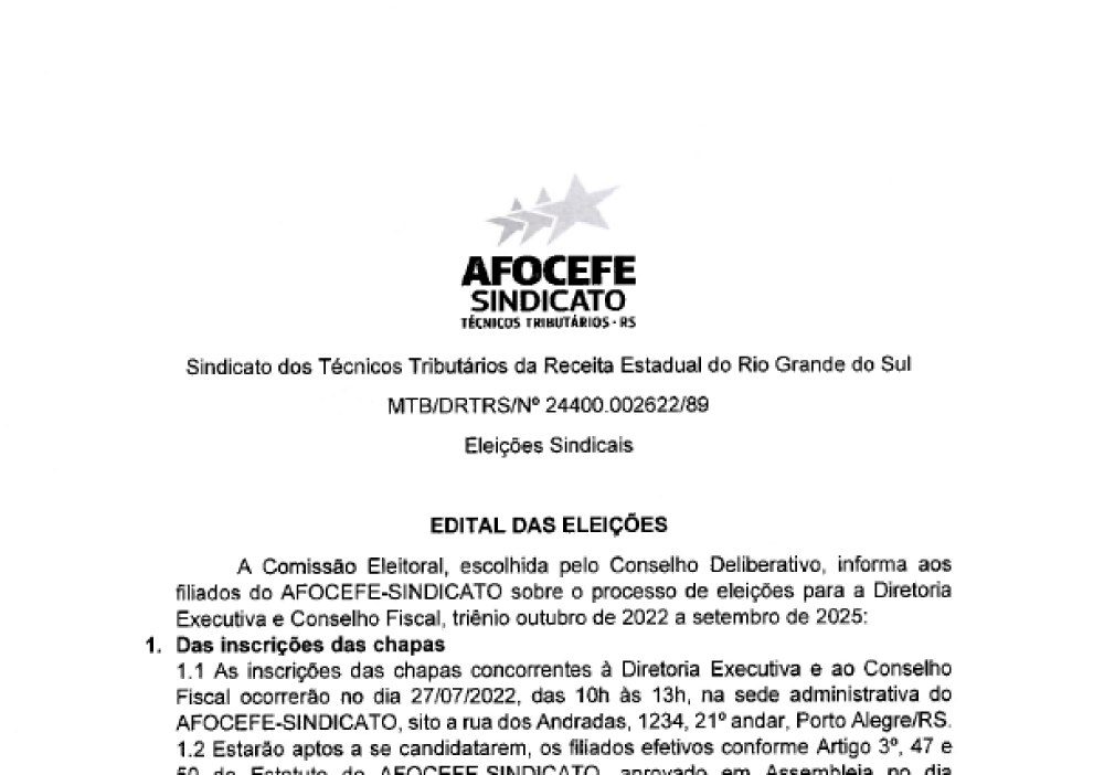 Na manhã de quarta-feira (16/7), a Comissão Eleitoral recebeu a inscrição de três chapas para a eleição da diretoria do Afocefe Sindicato na gestão 2025-2028. Para o conselho fiscal, foram inscritas apenas duas chapas. O prazo para impugnação vai até o dia 21 de julho, às 13h. A Comissão Eleitoral…