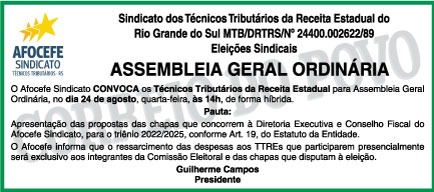 Publicado nesta terça-feira,23, no Jornal Correio do Povo, na Editoria de Economia – página 6, o edital de convocação de Assembleia Geral Ordinária para apresentação das propostas das chapas que concorrem à Diretoria Executiva e ao Conselho Fiscal do Afocefe Sindicato para o triênio 2022/2025.