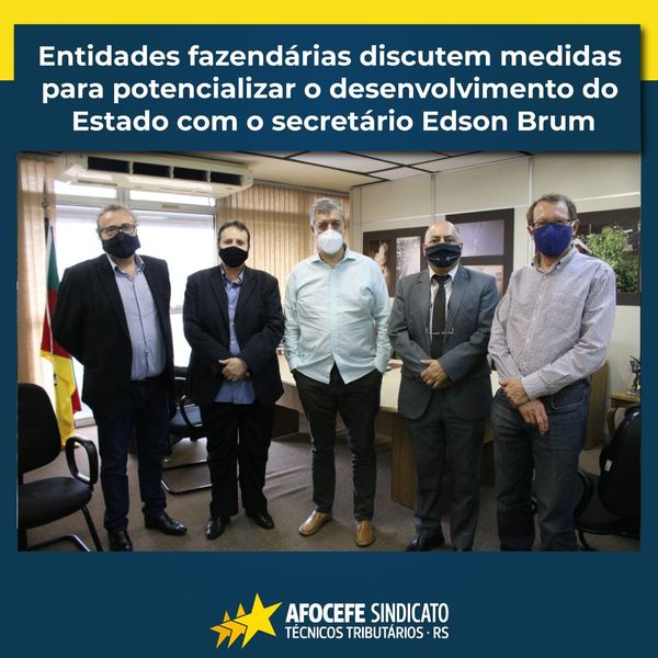 O Afocefe Sindicato, representado pelo presidente Guilherme Campos e pelo vice-presidente, Alatir Rech Ramos, o presidente do Sindifisco, Altemir Feltrin e o vice-presidente da Afisvec, Gonar Paulo Fernandes, reuniram-se nesta quarta-feira, 13, com o secretário de Desenvolvimento Econômico do Estado, deputado Edson Brum. O diretor administrativo da Secretaria, Técnico Tributário José Carlos Borges da Silveira Jr. e o chefe de gabinete do secretário, João Vitório Concatto, também participaram da reunião.