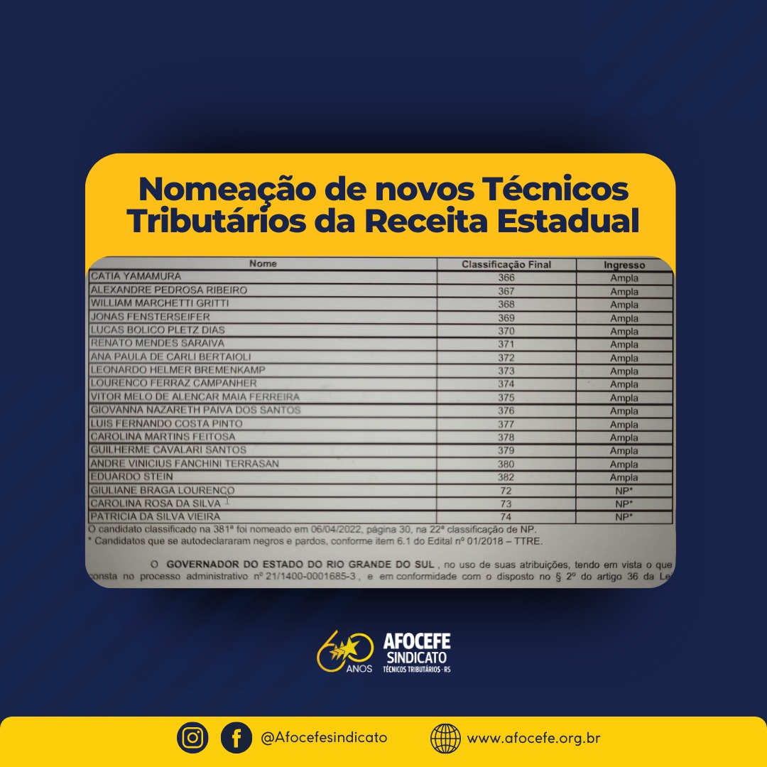 O Afocefe Sindicato parabeniza os novos colegas que irão fortalecer ainda mais a carreira, e segue empenhado para avançar nas nomeações e lotações em setores estratégicos da Secretaria da Fazenda para recompor o quadro de pessoal, e sanar o déficit existente.