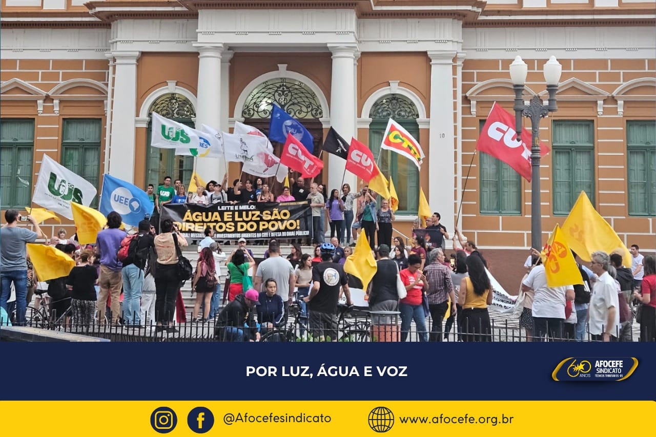 A Frente Gaúcha de Servidores mobilizou as entidades associadas nesta quarta-feira, 24/01, que se somaram ao ato de protesto contra as administrações municipal e estadual face ao descaso com a população que sofreu com a falta de luz e desabastecimento de água por vários dias após o evento climático de 16/01.