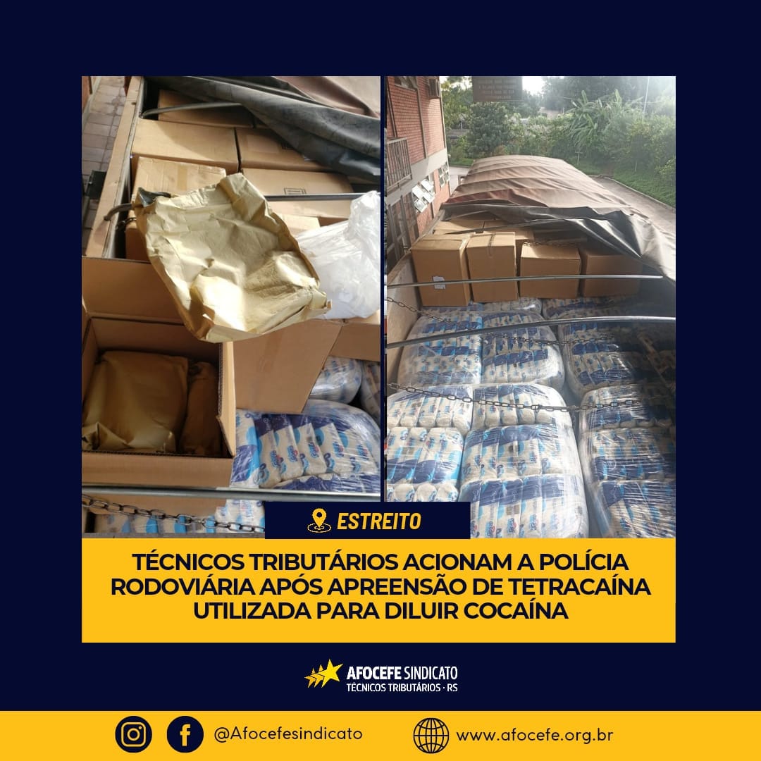 No dia 15 de abril, durante uma verificação de rotina no trânsito de mercadorias, após a conferência da documentação fiscal, os Técnicos Tributários da Receita Estadual lotados no Posto Fiscal de Estreito encaminharam à balança um caminhão transportando uma carga de arroz beneficiado. Na pesagem foi constatado o excesso de peso, e na retirada da lona foram encontradas 70 caixas do produto “Tetracaína”, totalizando 1600 kg. A substância é um anestésico utilizado para diluir Cocaína. Essa quantidade poderia ser utilizada na produção de até 5.000 kg do entorpecente. O produto foi avaliado em 6 milhões de reais. Após a constatação do ilícito, imediatamente os Técnicos Tributários acionaram a Polícia Rodoviária Federal de Passo Fundo para as devidas providências legais. Embora não seja atribuição da Receita Estadual controlar e fiscalizar o tráfico de entorpecentes, ou mesmo de produtos químicos que podem ser utilizados na elaboração de drogas ilícitas, toda vez que a Fiscalização flagra o transporte irregular destas mercadorias, aciona o órgão competente, atuando como uma espécie de coadjuvante no combate a este tipo de criminalidade. Com alguma frequência também trabalha de forma similar na apreensão e encaminhamento aos órgãos competentes de produtos oriundos do Contrabando e da Pirataria. O Afocefe saúda o trabalho dos colegas lotados no Posto Fiscal de Estreito pela iniciativa e cooperação com os demais órgãos de fiscalização, e ressalta que trabalha permanentemente junto à Secretaria da Fazenda pela necessária e urgente nomeação de novos Técnicos Tributários para atuarem no Trânsito de Mercadorias, seja nos Postos Fiscais de Fronteira, seja nas Turmas Volantes distribuídas pelo Estado.